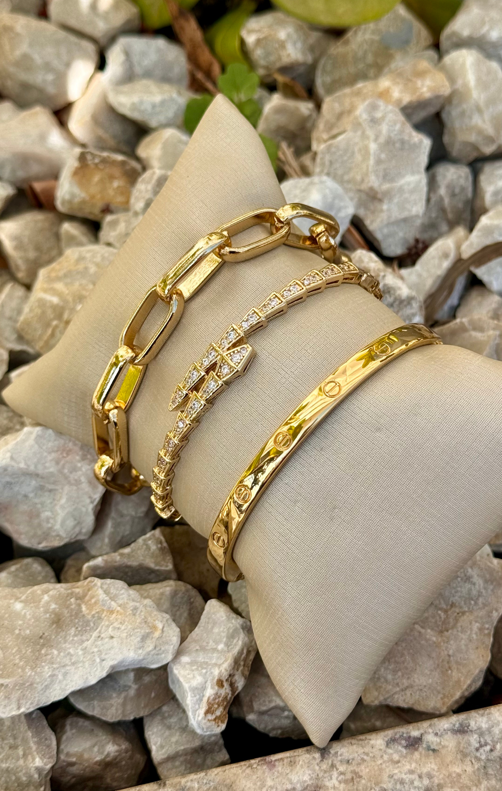 Kit com 2 braceletes e 1 pulseira deslumbrantes, combinando sofisticação e versatilidade em cada detalhe. O conjunto traz o brilho intenso do dourado aliado a designs icônicos: um bracelete de elos robustos, um modelo cravejado com pedras que refletem a luz com elegância e um clássico minimalista de acabamento polido. Perfeitos para usar juntos em um mix luxuoso ou separadamente para um toque sutil de estilo, esses braceletes elevam instantaneamente qualquer look, do casual ao sofisticado.
